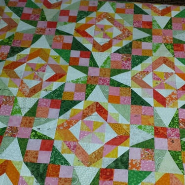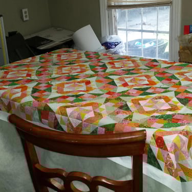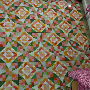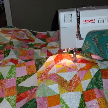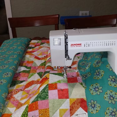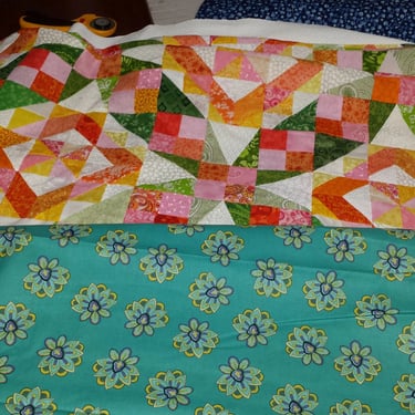 I finished the quilt piecing quickly, in under a month. Not bad for a beginner. After putting the quilt top together I realized I didn’t buy enough fabric for the backing. Luckily I had bought a lot of fabric and one of them worked with the color scheme on the quilt top.
